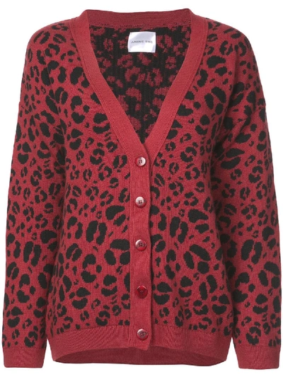 Red cotton blend justine leopard print cardigan from Anine Bing featuring a bordered deep V neck a front button fastening a relaxed fit long sleeves a ribbed hem and cuffs and an internal logo patch. The worlds destination for incredible fashion for incredible women.