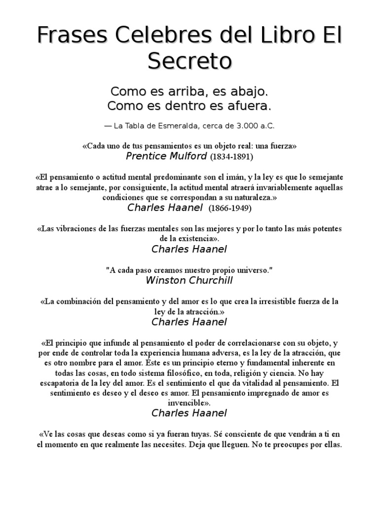 LLaa TTaabbllaa ddee EEssmmeerraallddaa cceerrccaa ddee. 24 frases del libro el secreto la ley dela atraccion. LAS 100 MEJORES CITAS DE EL SECRETO - Rhonda Byrne. Albert Einstein 1879 1955 2. VISUALIZACION CREADORA Un universo de riqueza abundancia y prosperidad que puede ser alcanzado por aquellos que están dispuestos a cumplir sus leyes y hacer uso de las herramientas que tenemos a nuestra disposición para lograrlo. Superación de las dificultades poder del amor búsqueda de la felicidad desarrollo personal motivación poder del pensamiento positivo ley de la atracción saber lo que quieres. Esta frase nos da la certeza de que cuando obtenemos el dinero o lo que sea que estemos.